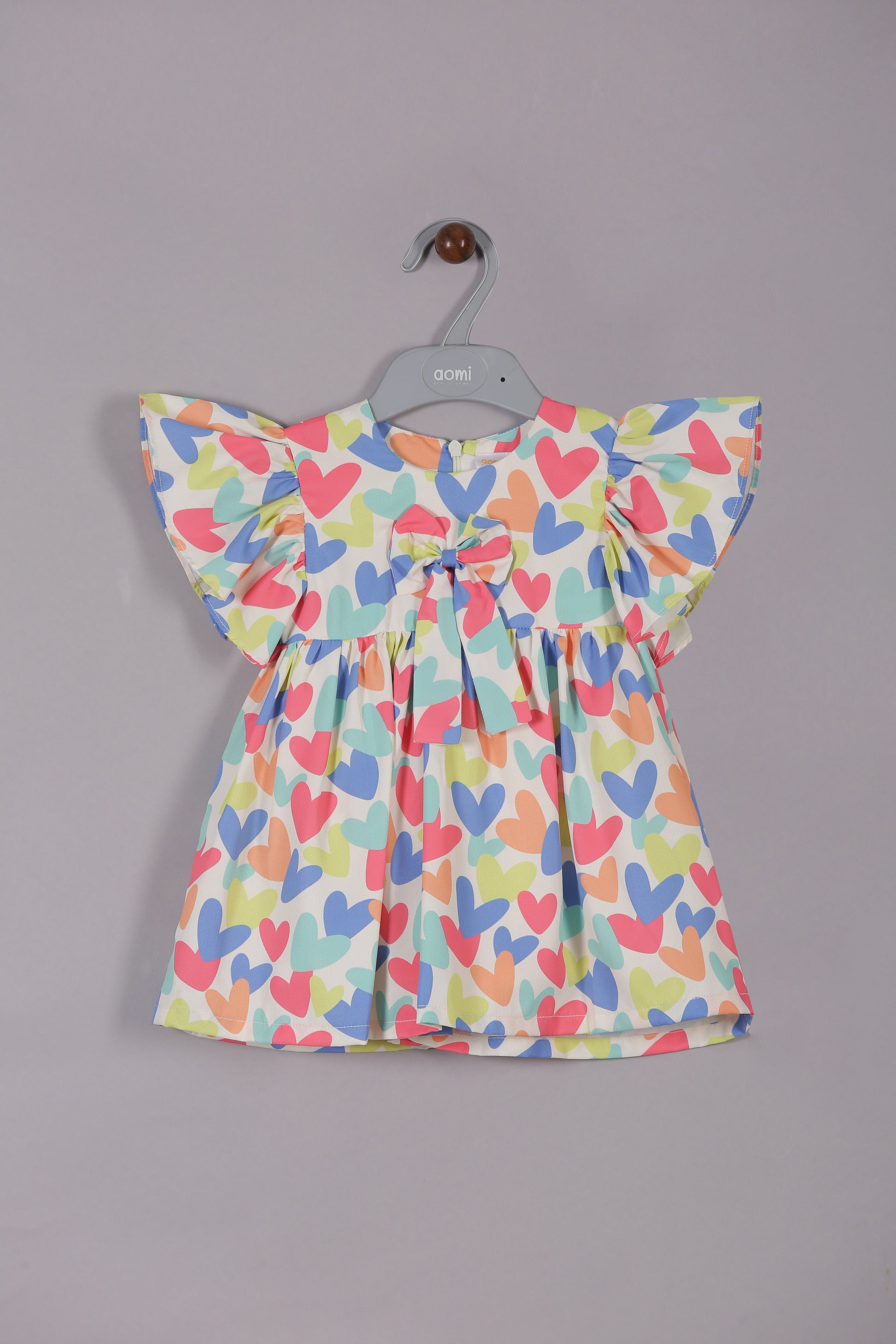 Aomi Blended Poly Cotton Multicolor Heart Print Flutter Sleeve With BowDress - Red